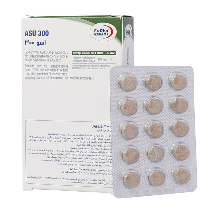 قرص آسو 300 یوروویتال به واسطه اثرات ضد التهاب و محافظت کننده ای که بر مفاصل دارد، نیاز به داروهای مسکن را کاهش می دهد. لذا می توان از این محصول به عنوان درمان کمکی برای تسکین علائم آرتروز استفاده نمود. در هر یک قرص آسو 300 میلی گرم از ترکیبات غیر صابونی عصاره آووکادو و روغن دانه سویا با نسبت 1 به 2 استفاده شده است. به این ترکیب اختصاصی استخراج شده از آووکادو و سویا به اختصار آسو (ASU) گفته می شود. تحقیقات نشان داده اند، آسو به عنوان یک درمان گیاهی برای کاهش التهاب و تسکین درد مفاصل بسیار مؤثر است.