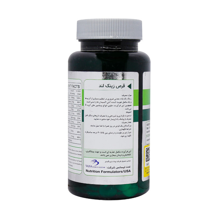 محصول زینک لند تحت لیسانس شرکت Nutrition Formulators آمریکا توسط شرکت وانا دارو گستر تولید شده است. این مکمل حاوی 60 عدد قرص در بسته بندی به فرم قوطی می باشد.