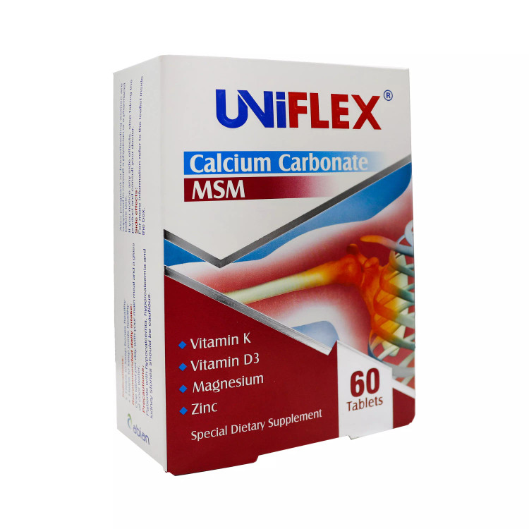 یونی فلکس مکملی با فرمولاسیون اختصاصی برای استخوان و مفاصل است که حاوی کلسیم، ام اس ام، ویتامین D، منیزیم، زینک و ویتامین K است.