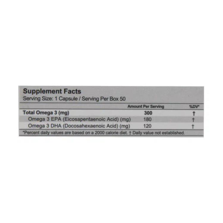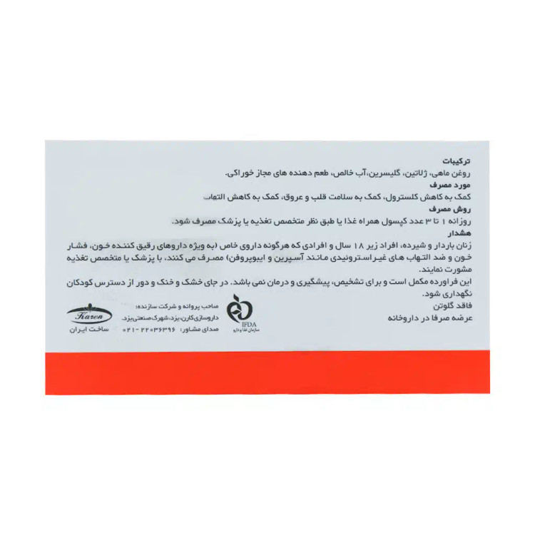 مشخصه ها: ترکیبات: روغن ماهی، ژلاتین، گلیسرین، آب خالص، طعم دهنده های مجاز خوراکی هر سافت ژل حاوی 1000 میلی گرم روغن ماهی، 300 میلی گرم امگا3 با طعم پرتقال فاقد گلوتن